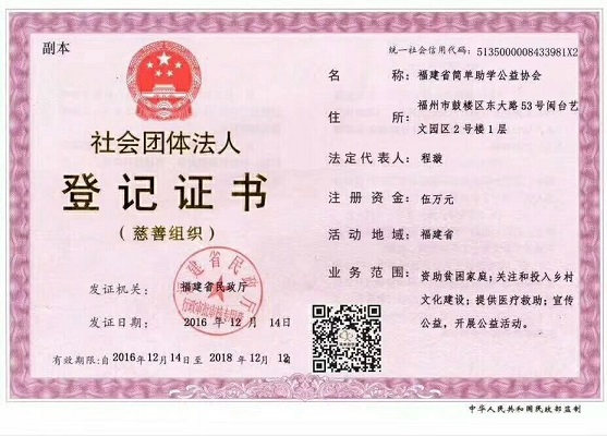 福建省简单助学公益协会由福州一群喜欢户外运动的白领驴友于2003年发起,是一家专注于协助困境学童发展的公益慈善类社团,2013年正式在福建省民政厅登记注册,现协会拥有3名全职工作人员,近十年来累计募集并发放善款2000多万元,帮扶省内外3000多名农村青少年读书成长。